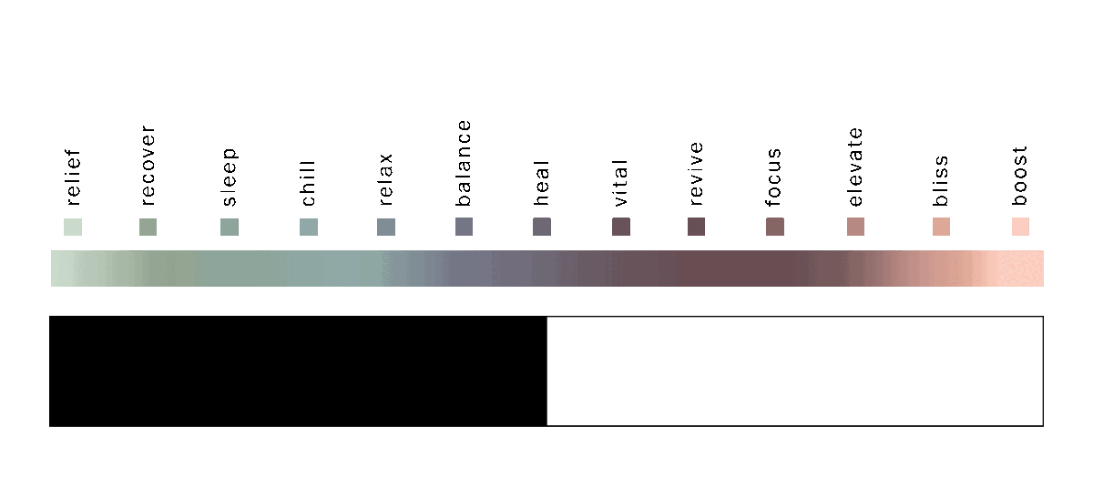 We chose to visually represent this spectrum of offerings as a color gradient ranging from healing blends like Relief and Recover to energizing blends like Bliss and Boost. Each blend receives its own hue, reinforcing individual product identity. The spectrum is grounded by the colors that have been part of BLNCD Naturals for years: black and white. The resulting brand is at home in both apothecary and beauty spaces.
